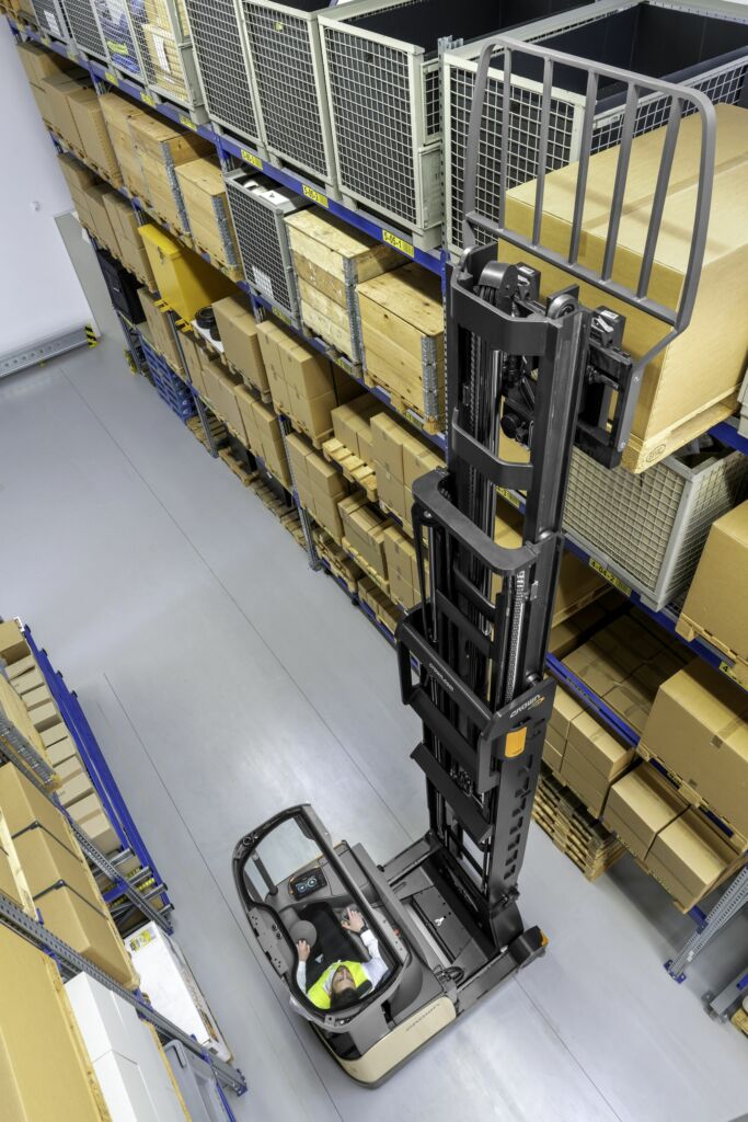 Die neuen Masten von Crown ermöglichen schnellere Absetz- und Aufnahmevorgänge von schweren Lasten auch bei großen Regalhöhen von bis zu 14,2m.Bild: Crown Gabelstapler GmbH & Co. KG