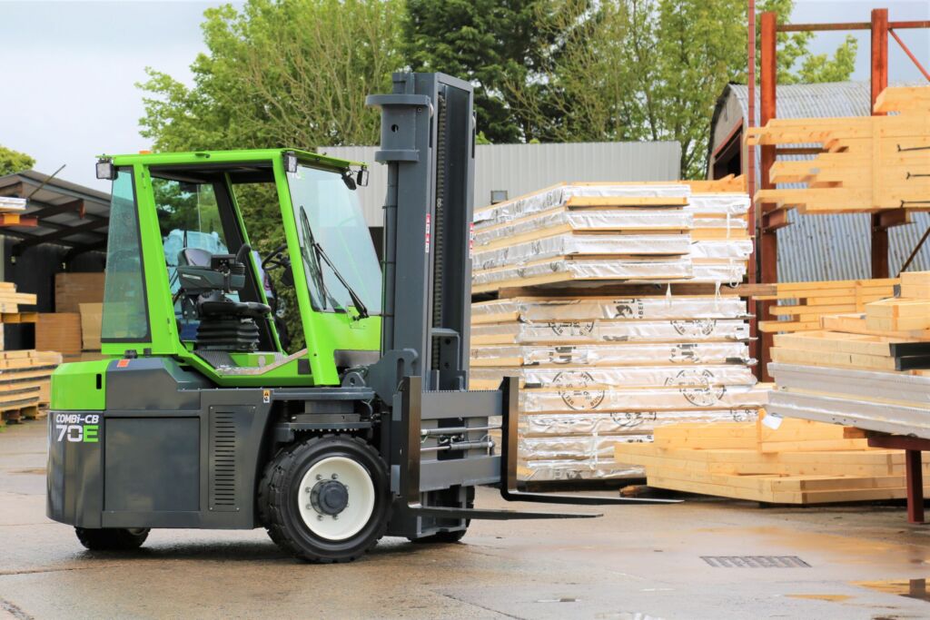 Der Combi-CB70E ist ein elektrisch angetriebener Mehrwege-Gegengewichtsstapler mit einer Tragfähigkeit von sieben Tonnen und ist für das Handling langer und sperriger Lasten auf engem Raum konzipiert. Ausgestattet mit dem patentierten unabhängigen Traktionskontrollsystem von Combilift und großen elastischen Gummireifen, ist er geländegängig und arbeitet gleichzeitig emissionsfrei. Die geräumige, gasgefederte Kabine mit Rundumverglasung bietet bessere Sicht und mehr Bedienungsfreundlichkeit, während der Auto Swivel Seat – der sich je nach Fahrtrichtung automatisch um 15° nach links oder rechts dreht – für optimale Ergonomie und Komfort für das Bedienpersonal sorgt, auch bei längeren Schichten.