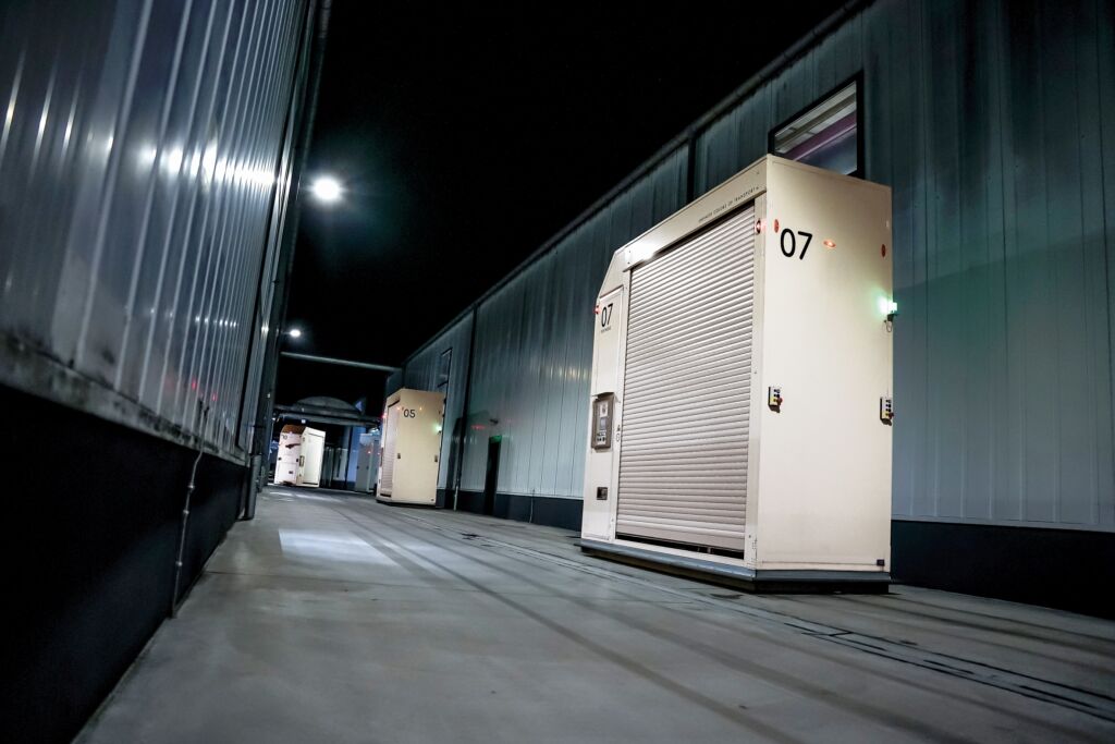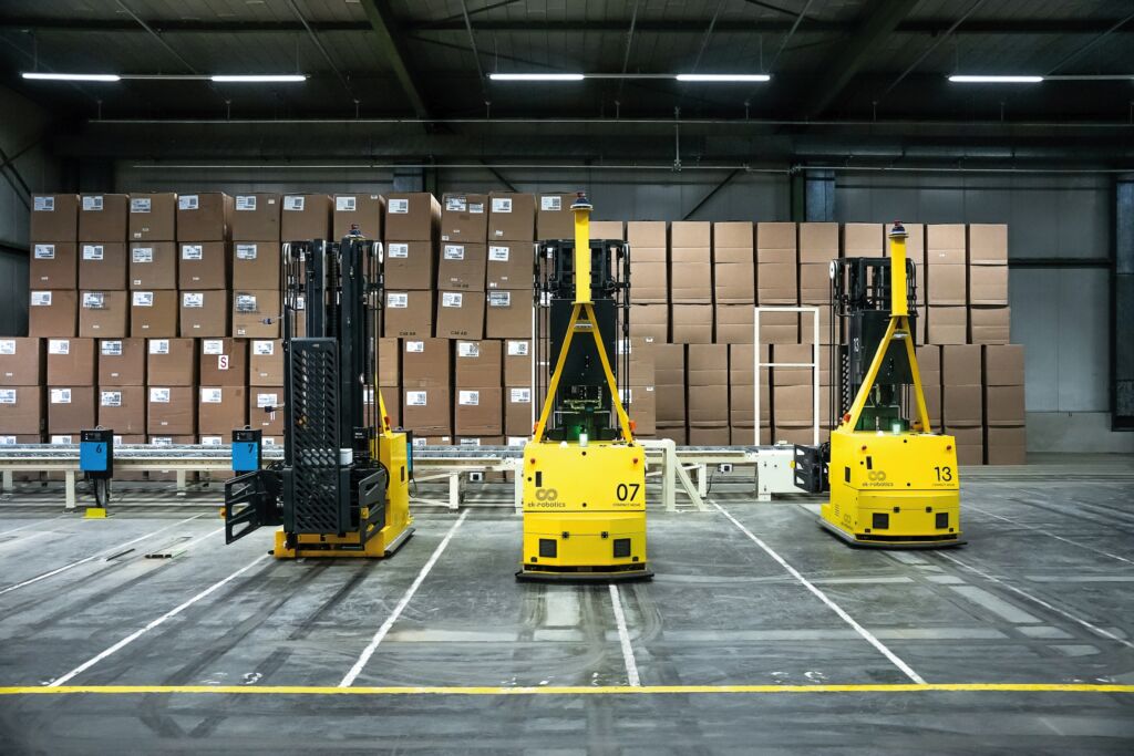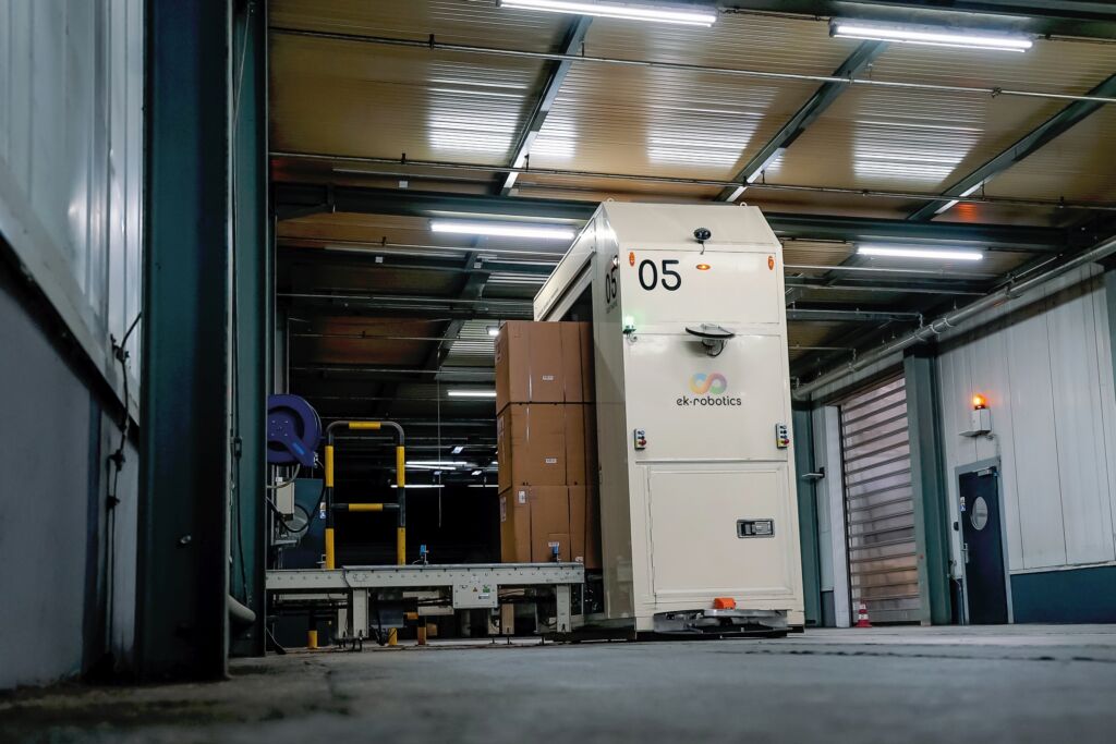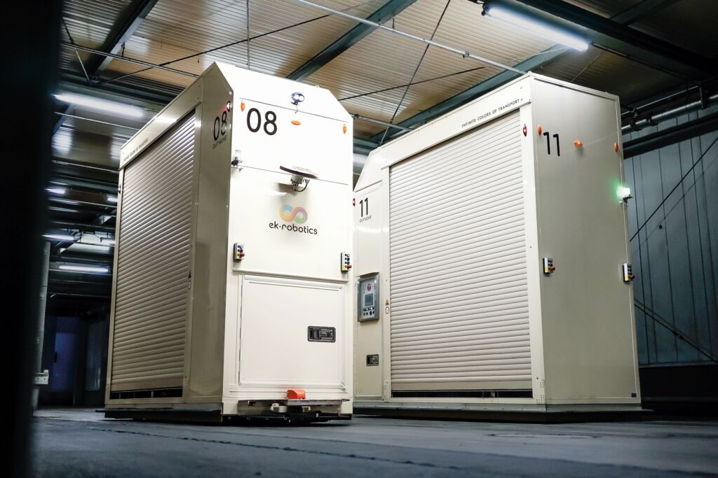Transportroboter: Die heute mittlerweile 18 eingesetzten, speziell angefertigten Transportroboter der Baureihe OUT MOVE sind wetterfest und verfügen über kundenspezifische Innenraumkonzepte. Um die Leistungsfähigkeit der Systeme langfristig zu gewährleisten, wurden Modernisierungsmaßnahmen durchgeführt. Unter anderem wurden die bisherigen mechanischen Sicherheitssysteme durch lasergestützte ersetzt, was die Fahrgeschwindigkeit und Transportleistung signifikant erhöhte. Mit elektrisch angetriebenen Rollenförderern können sie bis zu sechs sogenannte C48-Kartons oder vier Bin-Behälter transportieren. Ausgestattet mit modernster Sensorik und Sicherheitsmechanismen, erkennen die Fahrzeuge Hindernisse und gewährleisten innen sowie außen einen sicheren Betrieb im Mischverkehr.