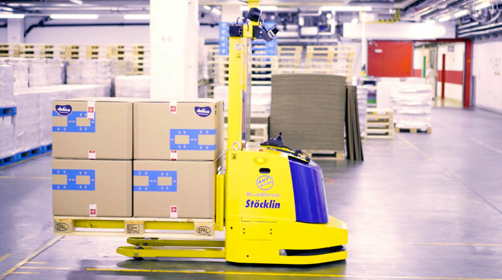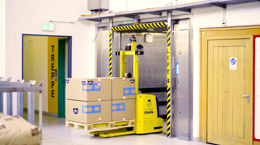 Um den Materialfluss zwischen Produktion und Logistik zu automatisieren, wählten die Delica-Verantwortlichen ein Stöcklin-FTS, ausgestattet mit der ANT-Navigationstechnologie von BlueBotics. Das Fahrzeug ist kompakt und arbeitet präzise, sodass es in engen Gängen manövrieren und den Aufzug benutzen kann – ein entscheidender Faktor für Delica.