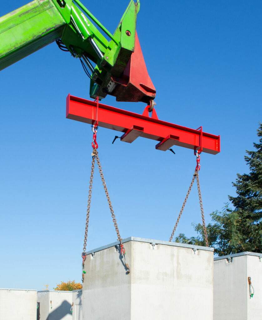 Die Balken-Traverse Typ BT zeichnet sich durch die mögliche Aufnahme mittels Gabelstapler als auch Kran aus. Bei einer Standardbreite von 3000mm sind verschiedene Ausführungen mit Tragfähigkeiten von einer bis zu fünf Tonnen lieferbar. Dabei sind die Aufnahmepunkte, in diesem Fall Wirbellasthaken, werkzeuglos in sechs verschiedenen Positionen je Seite verstellbar und ermöglichen so eine optimale Aufnahme der Last.