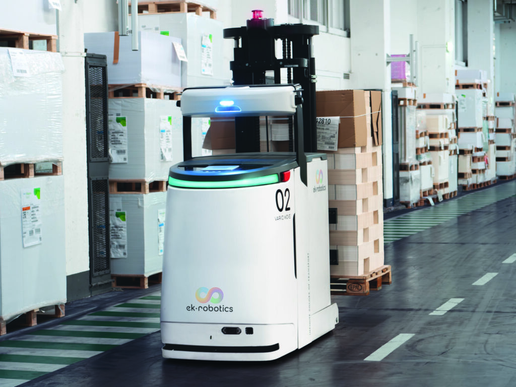 Vario Move im Einsatz bei GGP Media: Effizienter Materialfluss zwischen Druckmaschinen und Hochregallager.Bild: ek robotics GmbH