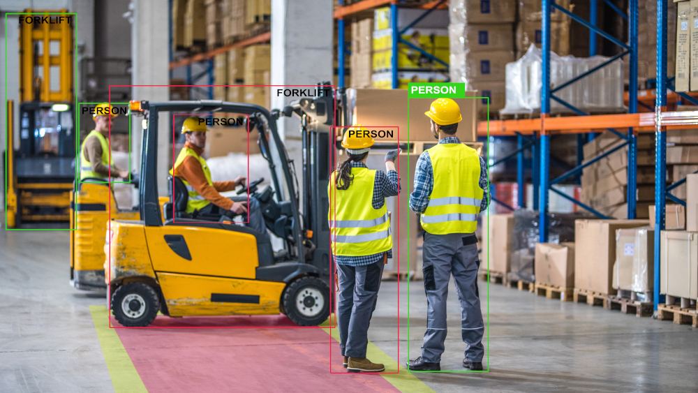 Mithilfe der KI-gestützten Objekterkennung werden Personen und Materialtransportgeräte sicher identifiziert. – Bild: Power Fleet GmbH