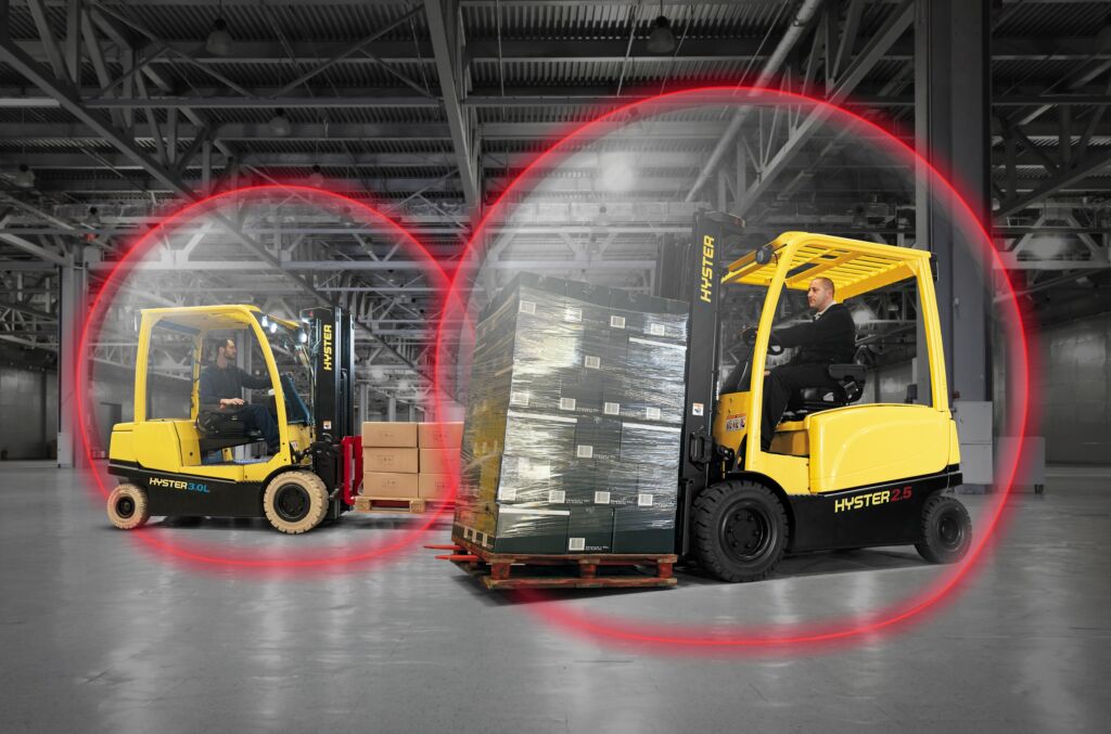 Näherungssensoren an Gabelstaplern – Die Geschwindigkeit wird automatisch begrenzt, wenn sich Fußgänger oder Fahrzeuge nähern oder wenn ortsspezifische Regeln eingehalten werden müssen. Beispiel: Gabelstapler nähert sich einer Kreuzung oder einer ausgewiesenen Fußgängerzone. Für die Leistungssteuerung erfassen lokale oder Echtzeit-Ortungstechnologien Fahrzeuge, Fußgänger und Leitbaken über Tags. Die Objekterkennung mit Lidar-Technologie erkennt auch Hindernisse im Fahrweg, die nicht mit Näherungstranspondern verknüpft sind.