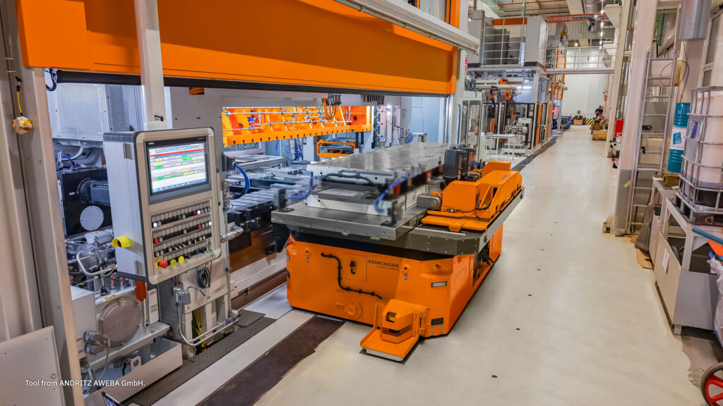 In enger Zusammenarbeit mit Audi entwickelte Genkinger eine maßgeschneiderte, innovative Lösung. Der Wechselprozess beginnt mit der Anlieferung der Werkzeuge per LKW und ihrer Entladung per Deckenkran auf einen mobilen Transportwagen. Dort werden sie millimetergenau positioniert. Danach wird das Werkzeug auf einen elektrischen Mehrwege-Werkzeugwechselwagen übergeben, der das Werkzeug zunächst manuell funkferngesteuert fährt und dann automatisch in die Presse einbringt.