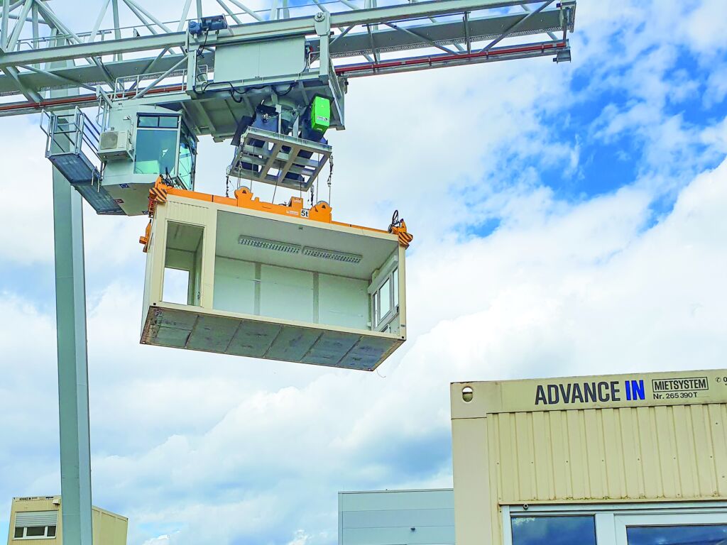 Während ISO-Container für gewöhnlich mit sogenannten Twist-Locks gesichert werden, gestaltete Kaup die Sicherung bei Algeco etwas anders. Denn der Spreader hat an jeder Ecke einen Aufnahmehaken, der in die seitlichen Öffnungen der Eckbeschläge eintaucht, um dort die Container für den Transport zu sichern. Das ist ein Verfahren, das bereits an anderen Algeco-Standorten eingesetzt wird und das aufgrund der eng stehenden Wohn- und Bürocontainer nötig ist.