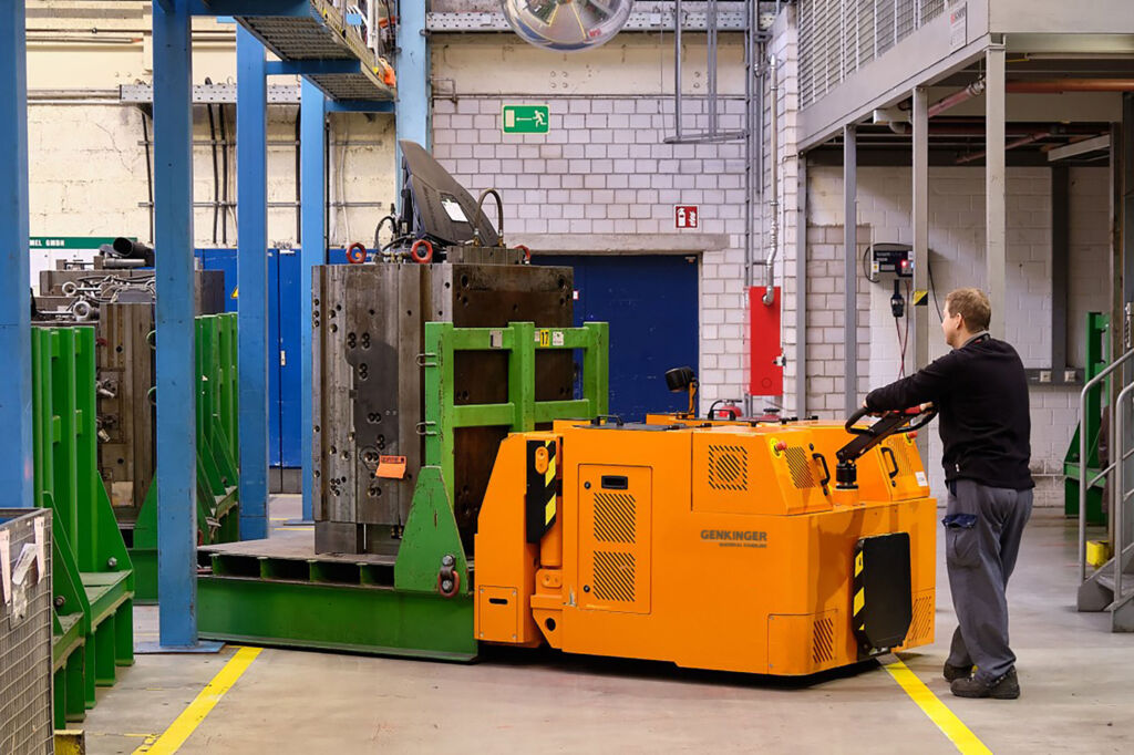 Bei einem weiteren Kunden aus der Automobilindustrie sind die Wege zwischen den Spritzgussmaschinen, dem Werkzeuglager und der Instandsetzung lang und eng. Mehrmals am Tag müssen Werkzeuge zwischen den einzelnen Stationen transportiert werden. Der Genkinger Werkzeugwechsler ersetzte einen Schlepper mit Anhänger, der nur sehr aufwendig rangiert werden konnte. Das neue Fahrzeug überzeugt hingegen durch: