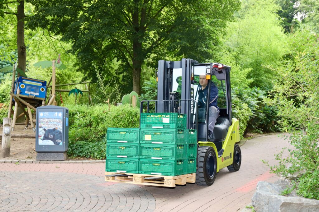 Die vielfältigen Anwendungsbereiche im Zoo mit sehr unterschiedlichen logistischen Anforderungen waren das passende Einsatzspektrum, um die Flexibilität, Robustheit und Vielseitigkeit der Clark Crossover-Baureihe auf den Prüfstand zu stellen: Innen- und Außeneinsatz, verschiedene Bodengründe, lange Transportstrecken, unterschiedliche Ladungsträger und Transportgüter sowie der Einsatz bei Nässe und Schmutz. Da der Clark Elektrostapler S30XE genau für diese Herausforderungen konzipiert worden ist, war das Ergebnis wenig überraschend: Der Renegade hat den Test im Zoo Duisburg mit Bravour bestanden und den Beweis angetreten, dass die Crossover-Stapler es in jeder Hinsicht mit Verbrennern aufnehmen können. Dies bestätigt auch Christopher Grefer, Mitarbeiter der Technischen Abteilung im Zoo Duisburg: „Besonders beindruckt hat mich neben der hohen Leistung und robusten Bauweise der sehr kleine Wenderadius des Elektrostaplers sowie die vielen ausgefeilten Sicherheitsfunktionen, die nicht nur die Arbeit mit dem Stapler erleichtern, sondern auch das Unfallrisiko bei uns im Zoo reduzieren können.“ Ein weiterer Pluspunkt war die automatische Zinkenverstellung. „Damit können wir die Gabeln bequem per Knopfdruck auf die oftmals sehr unterschiedlichen Ladungsträger hier im Zoo einstellen,“ so Grefer. Beeindruckt hat den Zoo Duisburg auch die 360°-Kamera mit KI-basierter Fußgängererkennung. Die Rückfahrkamera überträgt in Echtzeit den Fahrweg und die Umgebung hinter dem Stapler direkt auf das Farbdisplay. Damit hat der Fahrer auch bei Rückwärtsfahrt stets einen Überblick über das, was sich hinter dem Stapler befindet. Dies erhöht bei Einsätzen die Sicherheit. Doch der Reihe nach…