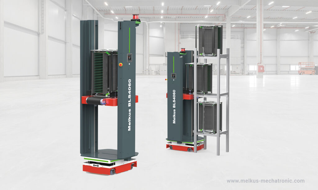 Das innovative Liftsystem des Melkus Rack Stackers wurde speziell für Transporte und Übergabesituationen in der Elektronikfertigung oder Feinmechanikproduktion entwickelt. Es ermöglicht die flexible Übergabe von Transportgütern an Übergabestationen auf unterschiedlichen Höhen von 32 bis 1.800mm. Dennoch passt das innovative AGV mit einer Gesamthöhe von 1.950mm durch jede Standard-Tür. Die präzise und effiziente Übergabe erfolgt beidseitig über ein integriertes Förderbandsystem mit Klemmbacken zum Ergreifen der Ladungsträger. Ein optional integrierter RFID-Scanner ermöglicht das automatische Identifizieren der Behälter. So lässt sich die gesamte Transportkette vom Auslagern bis zur Bereitstellung lückenlos automatisieren.