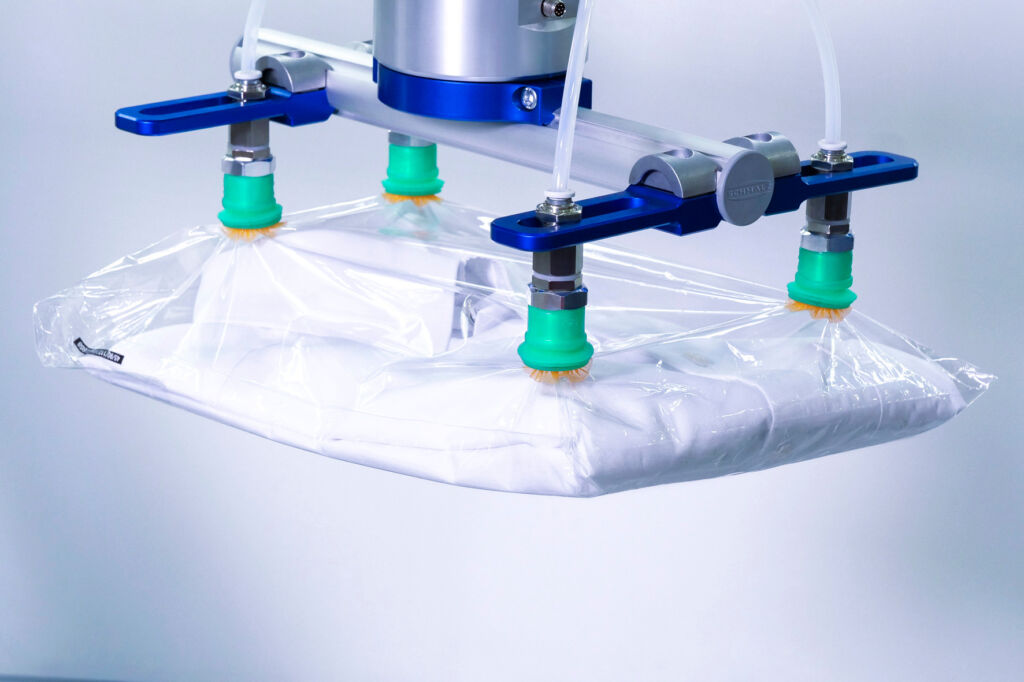 Für den automatisierten Griff in die Kiste eignet sich der Bin-Picker SBPG. Er entnimmt aus Behältern mit chaotischem oder vorsortiertem Packbild frei geformte Teile. Sein flexibler Sauggreifer passt sich optimal an die Kontur des Werkstücks an, dabei ist er leicht und durch die integrierte Vakuum-Erzeugung einfach zu reinigen.