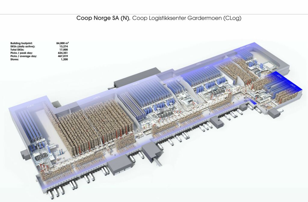 Die Aufgabe an Gaute Glomlien von COOP und Holger Weiß von Witron beschrieb sich wie folgt: die Trocken-, Frische- und Tiefkühl-Logistik unter Covid-19-Schutzmaßnahmen von 52.000m2 auf 84.000m2 zu erweitern, den Durchsatz um 30 Prozent zu steigern, neue COM-Maschinen zu integrieren, ebenso zusätzliche Paletten- und Tray-AKL-Gassen sowie diverse Fördertechnik-Komponenten einzubauen. Den vollautomatischen Warenausgangspuffer zu vergrößern. Das dazugehörige WMS-System auf den neuesten Stand zu bringen. Und alles während des laufenden Betriebes – natürlich ohne Leistungsverlust – in den bestehenden Materialfluss einzubinden.