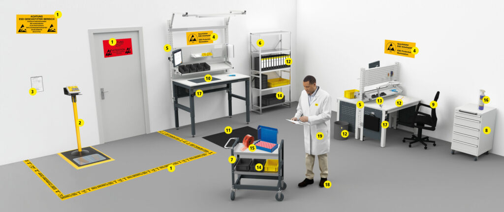 Bei Arbeiten mit elektronischen Bauteilen in der Produktion oder Montage ist es besonders wichtig, eine ESD-geschützte Umgebung einzurichten. Der ESD-Bereich bezeichnet einen Arbeitsplatz oder eine Produktionslinie, die komplett gegen elektrostatische Entladungen geschützt oder geerdet ist. In einer solchen „Electrostatic Protected Area“ (EPA) umfassen die Schutzmaßnahmen alle Bereiche von Bodenbelägen, Tischbelägen, Werkzeuggriffen, Kleidung sowie Personenerdung, je nach benötigter Sicherheitsstufe auch Zutrittskontrollen. Die Raumfeuchtigkeit und eine saubere Umgebung spielen dabei ebenso eine bedeutende Rolle. Möglich sind EPA sowohl mit Einzelarbeitsplätzen oder kompletten Elektronik- und Halbleiterfertigungen.