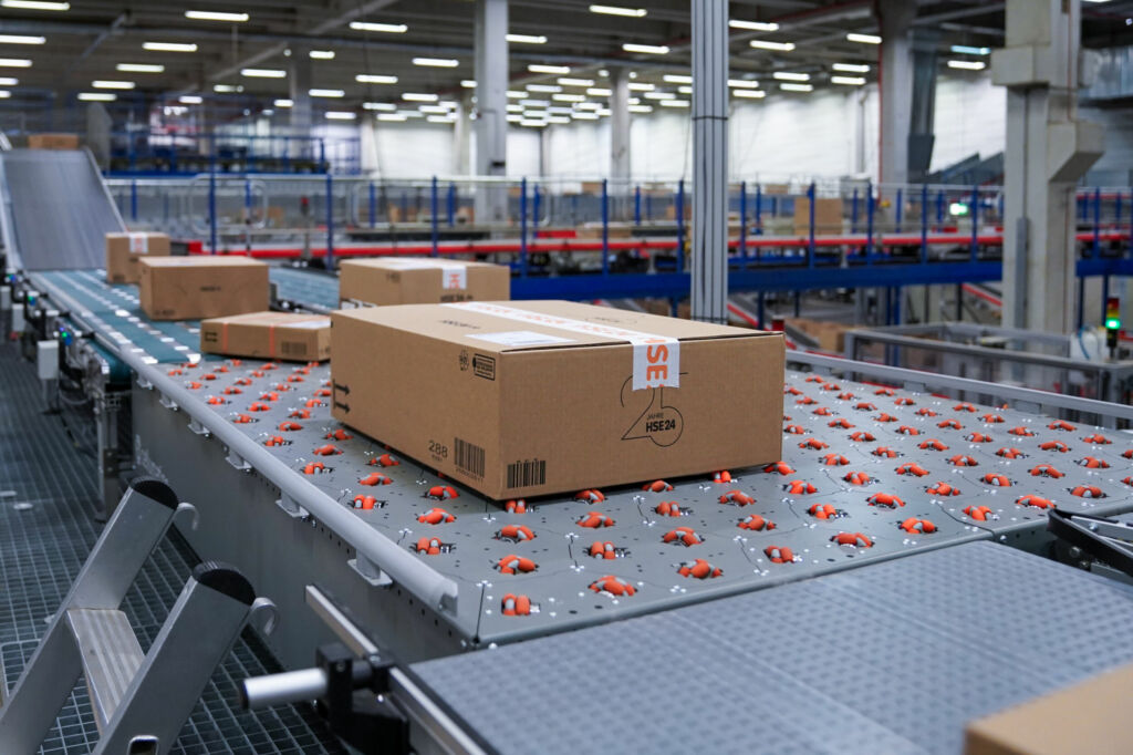 Mithilfe automatisierter Sortiertechnologie bereitet DHL Home Delivery im Logistikzentrum Greven Sendungen für HSE vor.