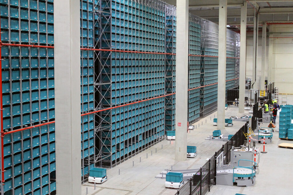 Zum Einsatz kommen insgesamt über 100 Skypod-Roboter, die aus rund 174.000 Regalstellplätzen die Pickstationen sowie nachgelagert mit Transport-Robotern (AGVs) Packstationen bedienen.