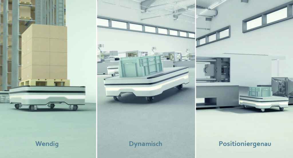 Wie bei so vielem gibt es auch bei fahrerlosen Transportfahrzeugen keine eierlegende Wollmilchsau und es muss das passende Fahrzeugkonzept zu den Gegebenheiten der jeweiligen Anwendung gefunden werden. Während bei Greenfield-Lösungen die Fahrzeuge meist genügend Platz zum Rangieren bekommen, geht es beim Nachrüsten bestehender Anlagen (Brownfield) meist deutlich enger zu und die Fahrzeuge müssen entsprechend wendiger sein. Auch die Möglichkeit zur Feinpositionierung gilt es zu berücksichtigen, z.B. wenn das Fahrzeug Übergabestellen sehr präzise anfahren und dazu rangieren muss. Weitere Punkte sind die geforderte Dynamik beim Beschleunigen und Bremsen sowie das Gewicht der zu transportierenden Lasten. Geklärt sein muss außerdem, wie schnell sich die Fahrzeuge bewegen müssen, damit der Logistik- oder Produktionsprozess optimal abläuft. Sind solche Fragen rund um die Anwendung beantwortet, wird sich der Hersteller für ein Konzept entscheiden. Neben Fahrzeuggröße und Batteriekapazität liegen die wesentlichen Unterschiede dann in der Anzahl der benötigten Antriebs- und Bockräder sowie ihrer Traglast.