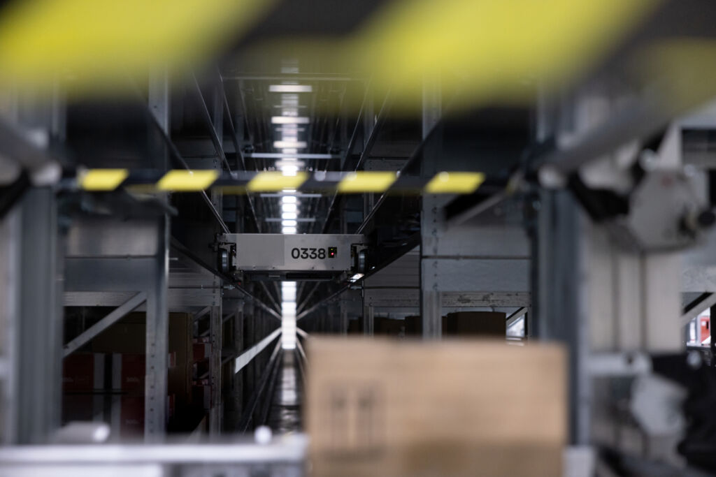 Der Weg der Produkte von Anlieferung bis Auslieferung ist genau durchgetaktet: Die Paletten werden ins Inbound geführt, und ab da geht der vollautomatische Prozess los: Kameras und Sensoren erfassen sämtliche Daten von Größe, Gewicht und Barcode bis Mindesthaltbarkeit und Zustand der angelieferten Produktverpackung. Anschließend bringt ein Transportshuttle die Ware an den automatisch ermittelten Lagerplatz, der sich dynamisch an die Nachfrage anpasst: Die aktuell meistverschickten Produkte bekommen die vordersten Lagerplätze mit den kürzesten Wegen. Für längere Haltbarkeit von Lebensmitteln ist ein Teil des Lagers abgedunkelt und sauerstoffreduziert.