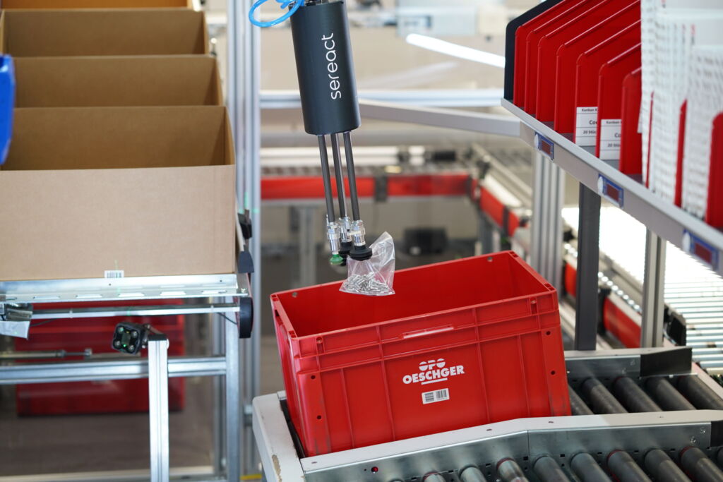 Sereact überzeugte OPO Oeschger durch die Bereitschaft, sich konsequent an den bestehenden Rahmenbedingungen zu orientieren. „Das Team von Sereact kam zu uns vor Ort, hat sich intensiv mit unseren Abläufen beschäftigt und sehr schnell verstanden, wie unsere Prozesse funktionieren“, erklärt Daniel Schütz, Operations Manager Logistik bei OPO Oeschger. „Während andere Anbieter Standardlösungen vorschlugen, konnten wir mit Sereact gemeinsam individuelle Anforderungen umsetzen.“ Die Integration des Pickroboters erfolgte an einem bereits vorhandenen Kommissionierarbeitsplatz. Statt das Umfeld anzupassen, wurde der Roboter so gestaltet, dass er die Aufgaben eines menschlichen Mitarbeiters möglichst realitätsnah übernimmt: Er greift angediente Zielkartons und platziert diese auf zwei Zielplätzen. Wird angefordert einen Zielbehälter zu greifen, entfernt der Roboter vorher noch die Rutschmatte im Behälter. Aus einem angedienten Quellbehälter entnimmt der Roboter nun Artikel und legt diese in den vorbereiten Zielkarton oder -behälter. Im Anschluss gehen diese zur Weiterverarbeitung auf der Fördertechnik.