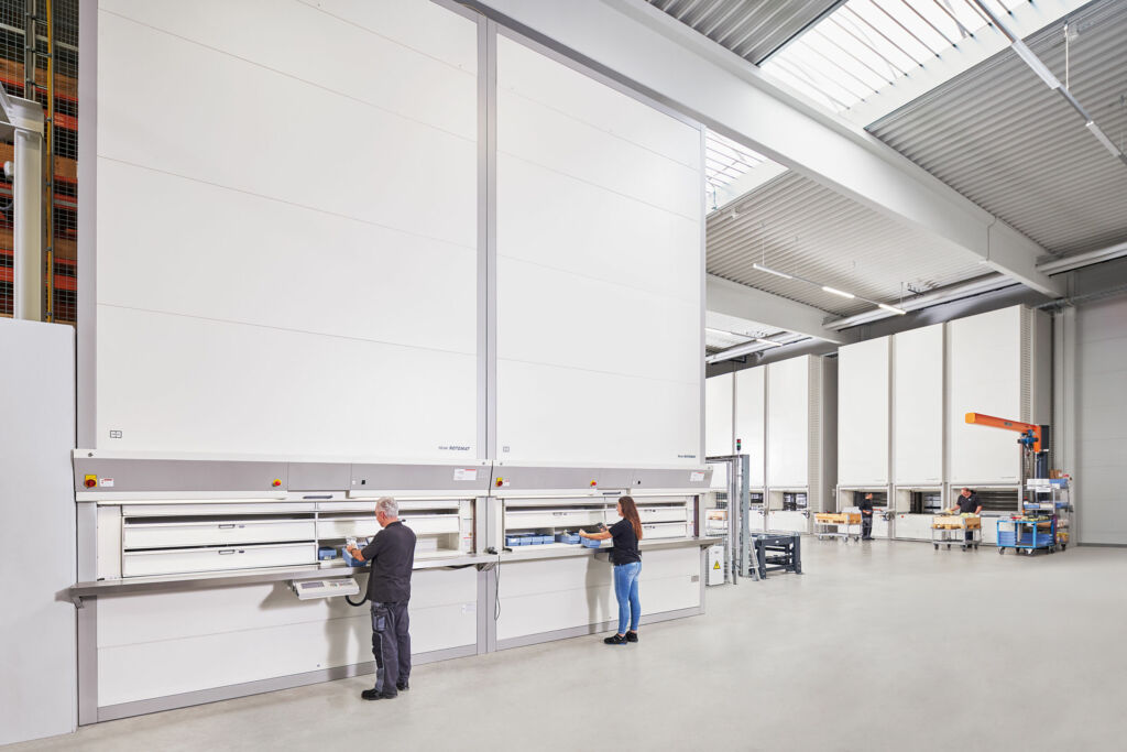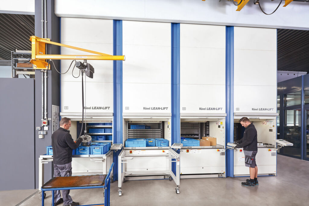 Im zentralen Lager kommen vier Hänel Rotomat Lagerlifte und sechs Hänel Lean-Lifte als Kleinteilelager zum Einsatz. Durch die vertikale Lagerung in den automatischen Hänel Lagersystemen kann die gesamte Höhe der Halle optimal genutzt werden. Dies führt zu einer signifikanten Einsparung von wertvollen Produktionsflächen und ermöglicht einen schnellen Zugriff auf Tausende unterschiedliche Kleinteile. Innerhalb kürzester Zeit können auch große Aufträge parallel von mehreren Mitarbeitern an den zehn Entnahmestellen abgearbeitet werden.