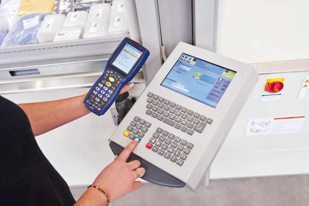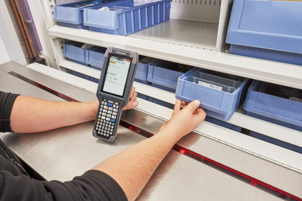 Die Mitarbeiter profitieren durch das barcodegestützte System mit Mobile Terminals von einer intuitiven Arbeitsweise und der starken Vereinfachung von komplexen Lagerabläufen. Die Hänel Lagerlifte sind in vier Gruppen organisiert. Per Barcodescan am Lift wird der entsprechende Auftrag initiiert. Nach Bestätigung des Auftrags an der Hänel Steuerung MP 12 N wird die gewünschte Position automatisch in die Entnahmestelle gebracht.