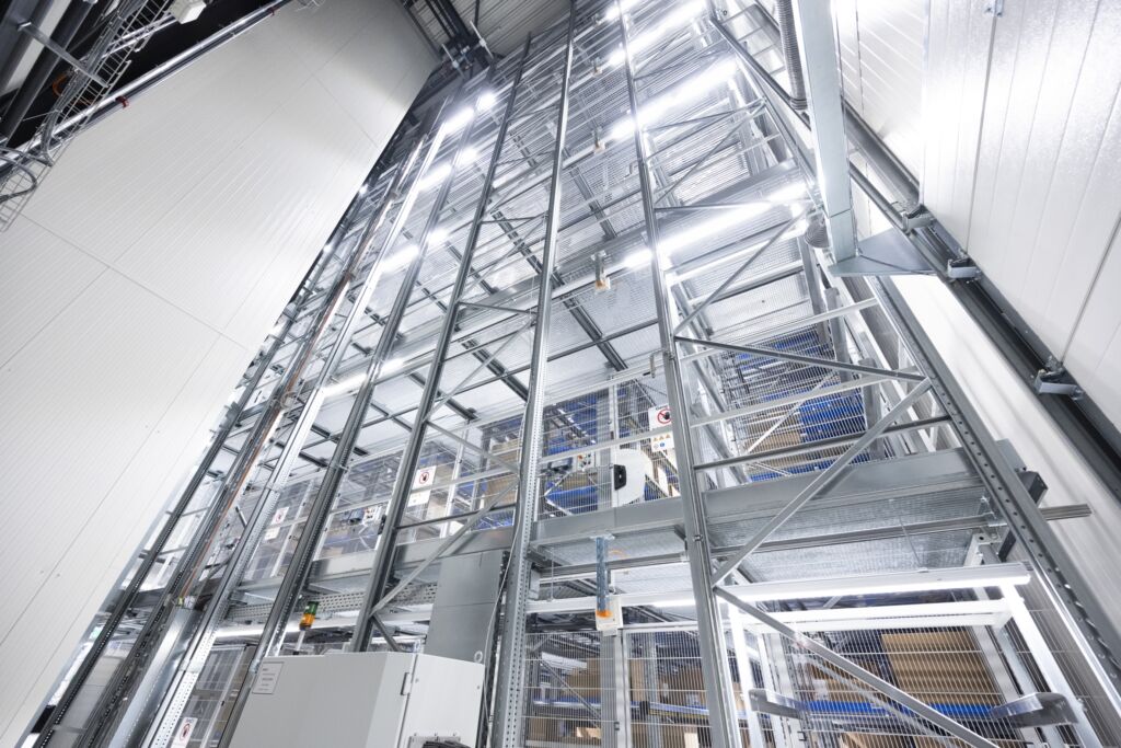 Das dreigassige Multishuttle-Tablarlager im Obergeschoss umfasst etwa 10.000 Behälterstellplätze auf 20 Ebenen. Die zuvor noch manuelle Ein- und Auslagerung der auf Tablaren befindlichen Ware übernehmen nun 60 Shuttles. Zwischen Lager und Kommissionierung erfolgt der automatische Transport der Behälter über drei Heber-Paare, die die Ware auf zwei parallelen Pufferbahnen mit einer Geschwindigkeit von bis zu vier Metern pro Sekunde befördern. „Dadurch, dass Lager- und Kommissionierbereich direkt übereinanderliegen, sparen wir Zeit durch kürzere innerbetriebliche Transportwege und optimieren unsere Logistikprozesse. Zudem nutzen wir die vorhandene Fläche jetzt bestmöglich aus – ein echter Gewinn für uns“, sagt Mayer.