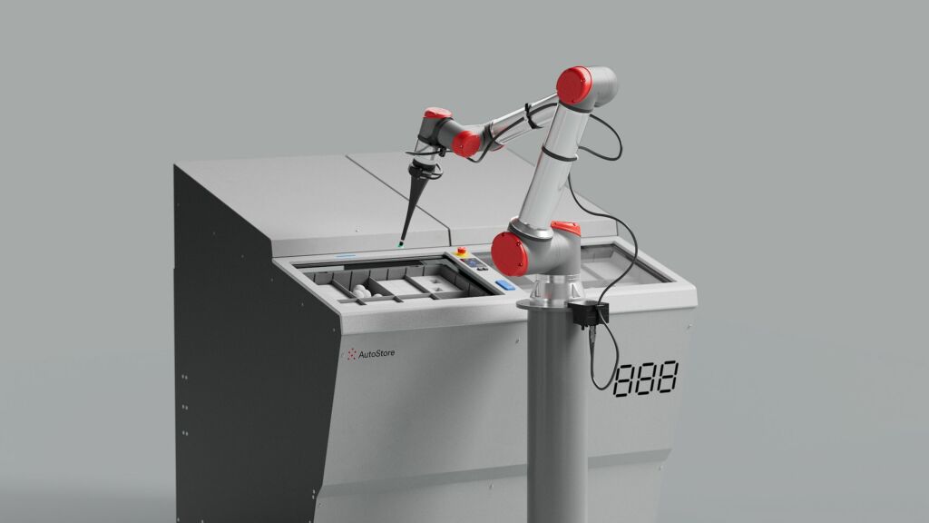 Der neue FusionPort mit zwei Entnahmeöffnungen kann auch mit einem Pick-Roboter bedient und in einen zweistufigen Kommissionierprozess kombiniert werden.Bild: AutoStore System GmbH
