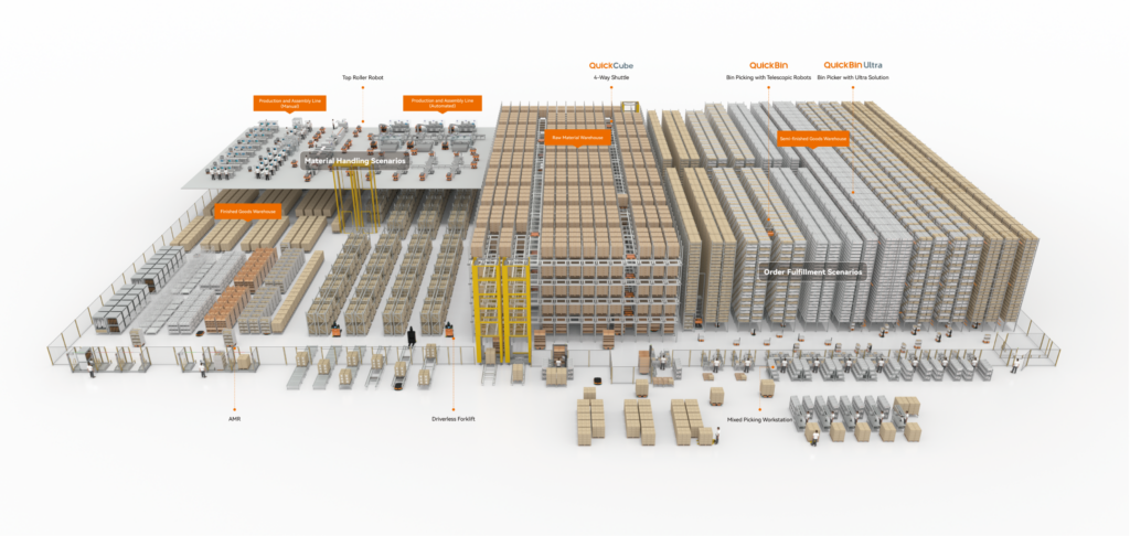 Quick Mix integriert mehrere Quicktron-Komponenten in eine umfassende Strategie. Innerhalb der End-to-End-Automatisierungsplattform Quick Cube ersetzt Quicktron herkömmliche Lifte durch kompakte 2-Richtungs-Lifte, die direkt in die Regalträger integriert sind, und arbeitet mit selbstentwickelten Vier-Wege-Shuttlebots zusammen, um eine ultra-dichte Palettenlagerung zu erreichen. Durch das Entfernen der unteren Regale kann Quick Cube auch ein G2P-‚Shelf-to-Person‘-System integrieren. Für ausgehende Warenflüsse übernehmen unterfahrbare mobile Roboter den Palettentransfer zu Pufferzonen, von denen aus Quicktrons omnidirektionale fahrerlose Gabelstapler die Paletten zu den Laderampen bewegen.
