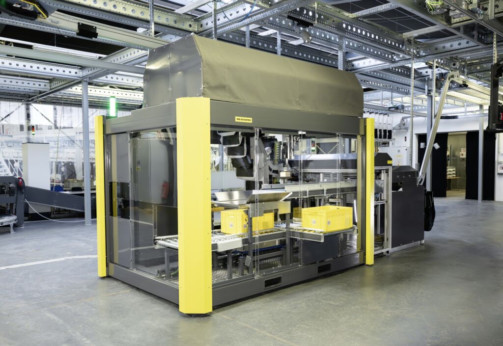 Wie das gelingt: In einem Ladungsträger, z.B. einem Behälter oder Karton, erreichen die Artikel via Fördertechnik die SSI Piece Picking Zelle. Dank der patentierten Greifertechnologie ist der Portalroboter in der Lage, Artikel mit den unterschiedlichsten Formen und Größen schnell und produktschonend zu kommissionieren. Dieser entnimmt einen Artikel aus dem Ladungsträger – bzw. aus einer Unterteilung innerhalb des Behälters – heraus und legt ihn auf ein kurzes Förderband innerhalb der Roboterzelle. Über dieses gelangt der Artikel zum Übergabeplatz und wird dort sanft in die geöffnete Tasche des SSI Carrier Taschensorters abgegeben. Die befüllte Tasche wird wieder in das Taschensorter-System eingeschleust und zu ihrem Zielort transportiert.