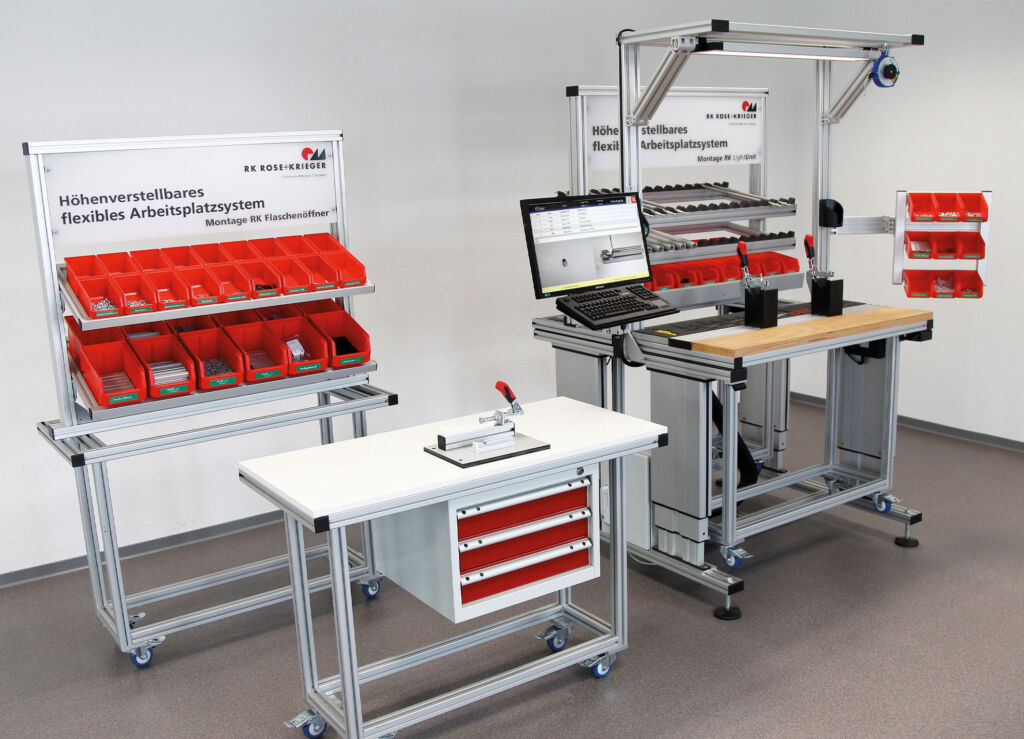 Die Anforderungen an industrielle Montagearbeitsplätze sind so individuell wie die Produkte, die an ihnen gefertigt werden. So müssen sie nicht nur den Mitarbeiter von körperlich belastenden oder monotonen Tätigkeiten entbinden, sondern auch dazu beitragen, dass die Arbeitsabläufe sicher und fehlerfrei umgesetzt werden. Häufig ist sogar die Einbindung in die digitale Arbeitswelt erforderlich. Darüber hinaus muss die Montagesicherheit auch bei einem Mitarbeiterwechsel garantiert sein – ein speziell im Hinblick auf die Qualitätssicherung entscheidender Faktor. Hier spielen LEAN-Ansätze und unterstützende Assistenzsysteme eine große Rolle. Mit den Lösungen von RK Rose+Krieger können vom einfachen Standardarbeitstisch bis hin zum (teil)automatisierten High-Tech-Arbeitsplatz mit Roboterunterstützung und optischen Assistenzsystemen aufgabenspezifische Montagearbeitsplätze einsatzbereit konfiguriert werden.