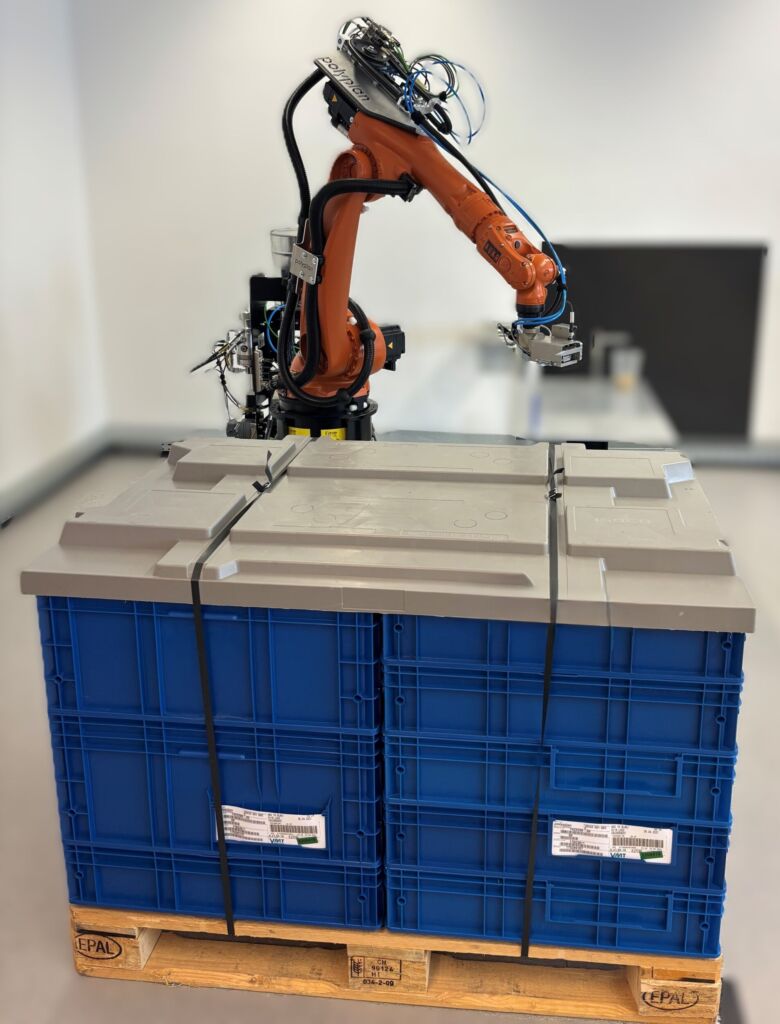 Polycut besteht aus zwei Komponenten: zum einen dem Roboterschneidkopf, der die Umreifungsbänder an Paletten, die mit KLT-Behältern oder Paketen beladen sind, erkennt und entfernt, und zum anderen der Übergabeeinheit, die die Reste der Umreifungsbänder vom Roboter übernimmt und aus dem Arbeitsbereich entfernt.