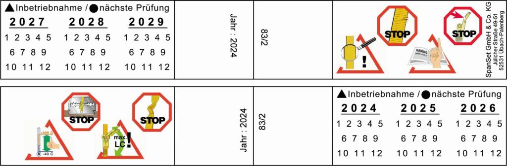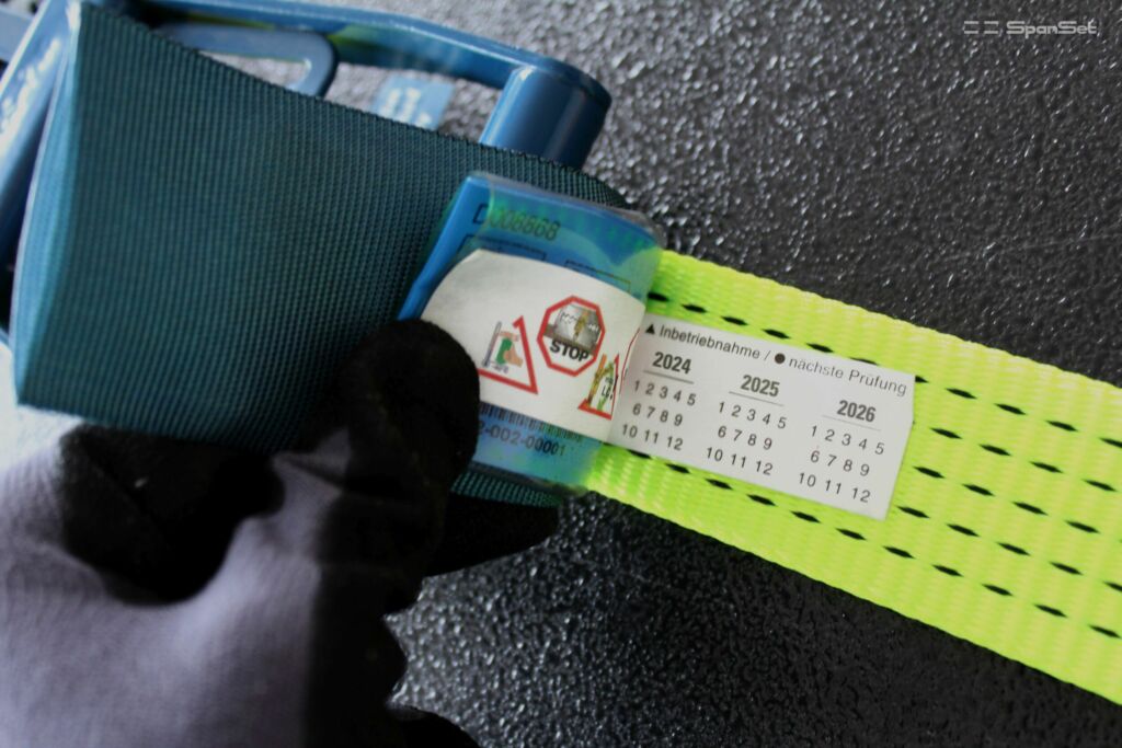 Zurrmittel von Spanset Deutschland verfügen über ein Zusatzlabel, dass die Dokumentation der Inbetriebnahme und jährlichen Prüfungen vereinfacht. Der Nutzer kann darauf Inbetriebnahme und die ersten sechs jährlichen Prüfungen mit einem wasserfesten Stift markieren. Zusätzlich ist die schriftliche oder digitale Dokumentation der definierten Prüfintervalle verpflichtend.